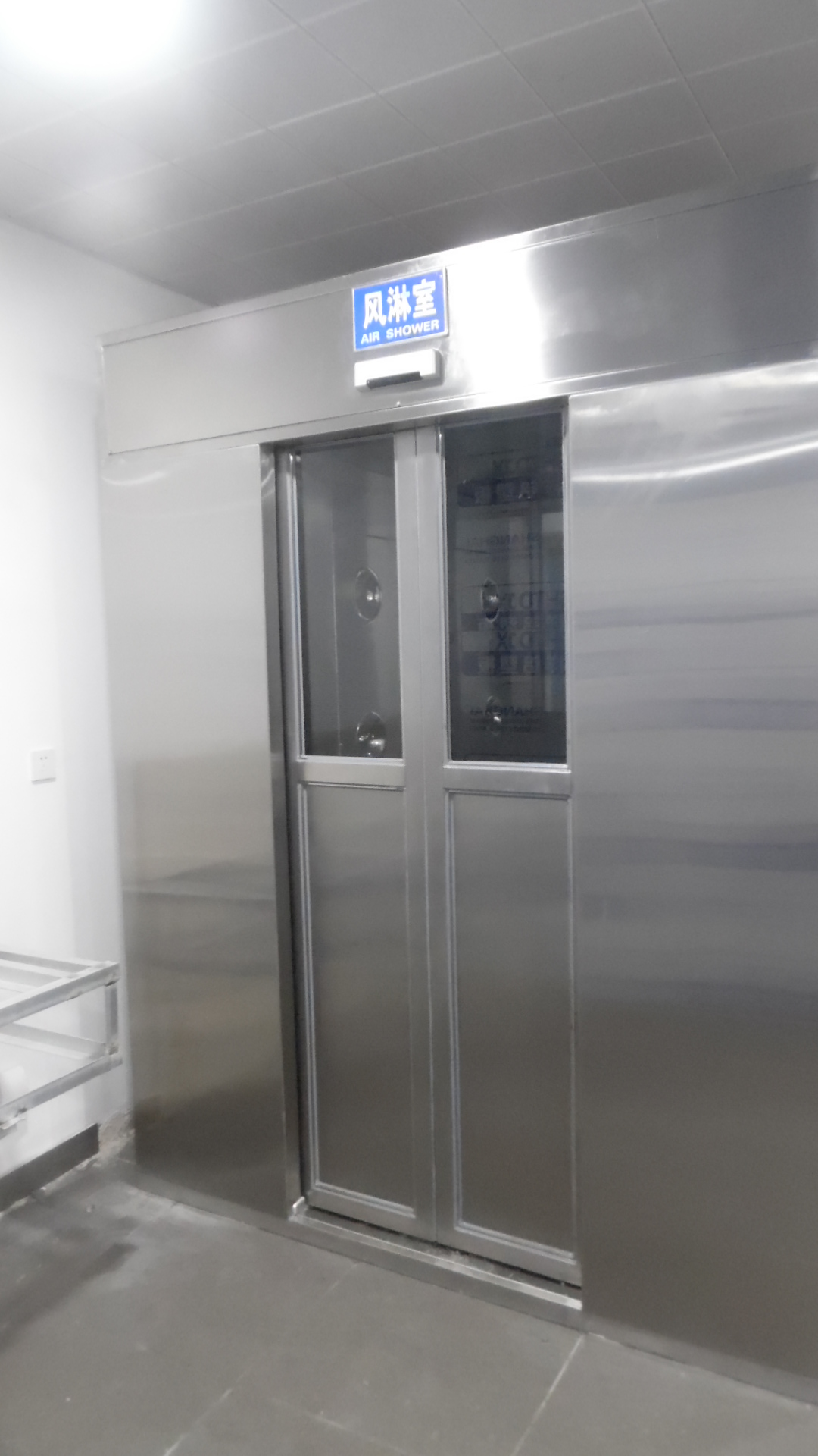 風淋室是人進入潔凈室所必需的通道,它可以減少進出潔凈室所帶來的污染問題,減少由于人貨進出帶來的大量塵埃粒子由潔凈室的入口處安裝功能齊全的“氣閘室”可以減少空氣污染微粒的數量,當人貨通過風淋室時,污染微粒被經過高效過濾的高度潔凈空氣射掉,25m/s以上的高風速確保了有效的噴射和飄移微粒經過初效和高效兩級過濾器基本過濾掉。為了保持風淋的安全使用,維持潔凈室環境的潔凈度